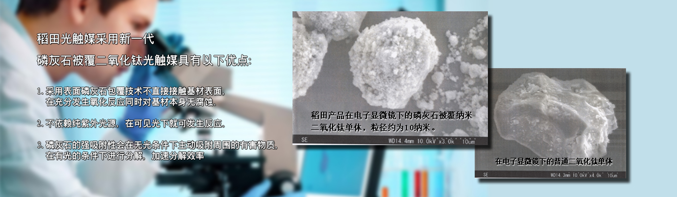 在認識【光觸媒】之前,要先了解什么是【觸媒】。觸媒是日語,翻譯成中文叫催化劑。催化劑是能在化學反應中加速反應速率,而本身在反應前后并不發(fā)生變化的物質。光觸媒是一種以納米級二氧化鈦為代表的具有光催化功能的光半導體材料的總稱。它涂布于基材表面,在光線的作用下,產(chǎn)生強烈催化降解功能:能有效地降解空氣中有毒有害氣體;能有效殺滅多種細菌,并能將細菌或真菌釋放出的毒素分解及無害化處理;同時還具備除臭、抗污、凈化空氣等功能。 稻田光觸媒采用【磷灰石被覆納米二氧化鈦分子結構】,具有吸附、分解、去除、無毒化的特質。表面磷灰石包覆技術不直接接觸基材表面,在充分發(fā)生氧化反應的同時對基材本身無腐蝕。其中的【磷灰石】成分,具有強大的吸附能力,可以隨時吸附空氣中的異味源、細菌、病毒等有害物質,再交由【二氧化鈦】在光源下進行分解反應,因此能夠24小時吸附、分解